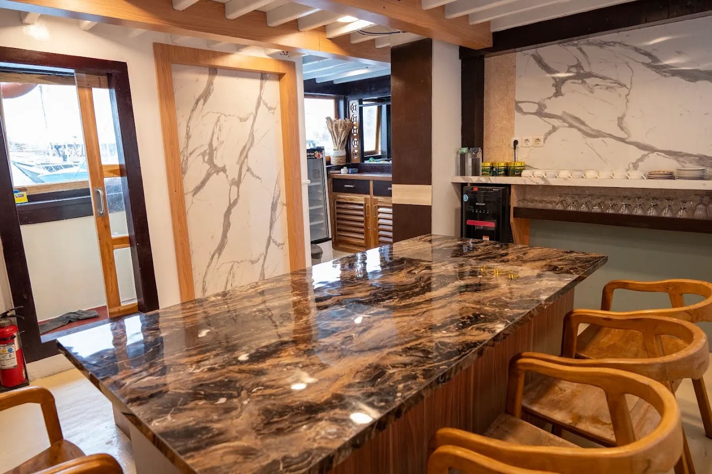 Alfathran Cruise Phinisi is equipped with a range of facilities designed to ensure a comfortable and enjoyable journey. Guests can enjoy air-conditioned cabins, a large outdoor area, and a daily meal service including breakfast, lunch, dinner, and snacks with coffee, tea, and mineral water available throughout. Additional amenities include snorkeling gear, life jackets, a refrigerator, a dispenser, and a Bluetooth sound system for entertainment. The boat also features safety equipment such as life rafts, ring buoys, fire extinguishers, and a first aid kit to provide peace of mind during your adventure.