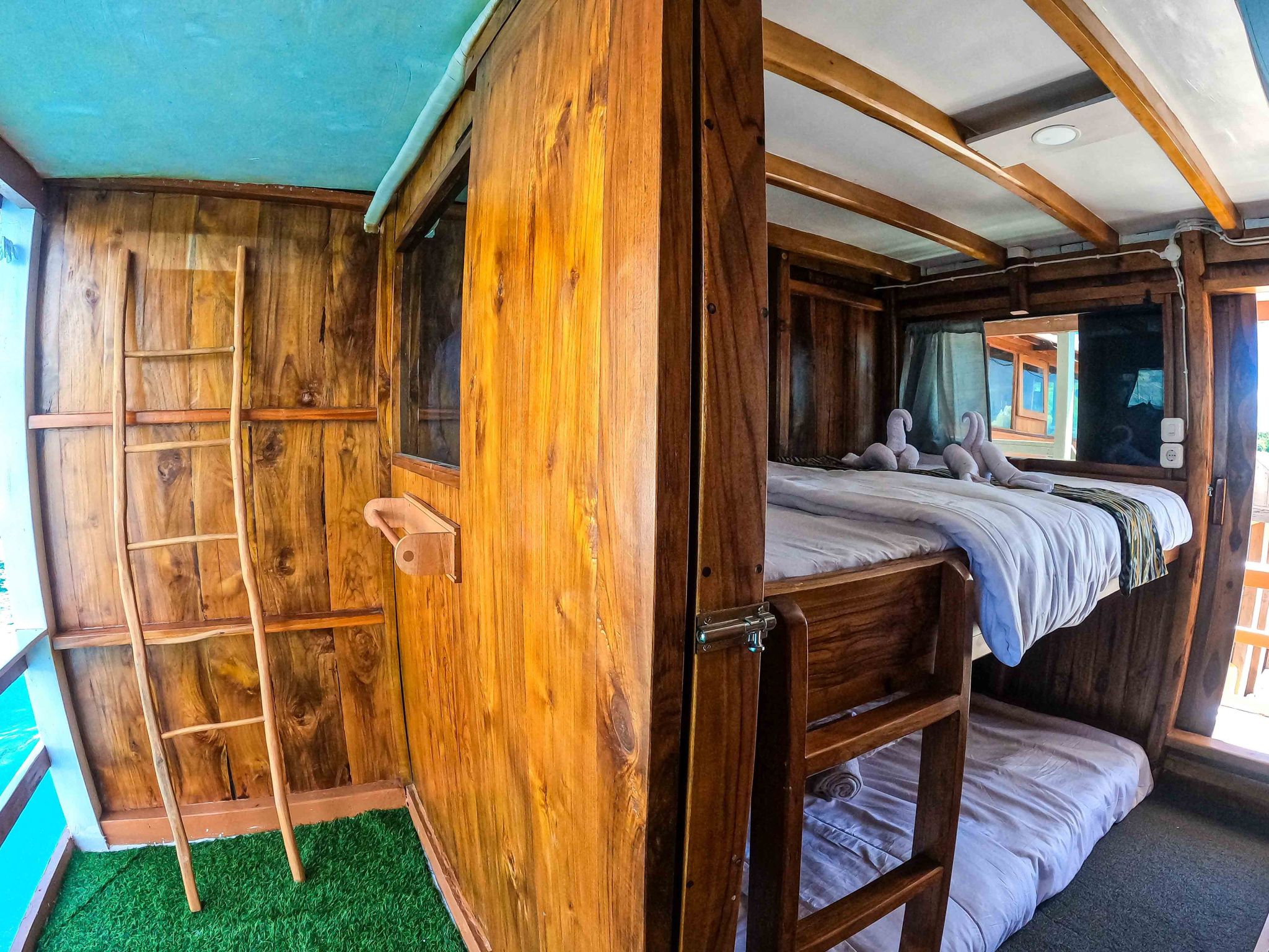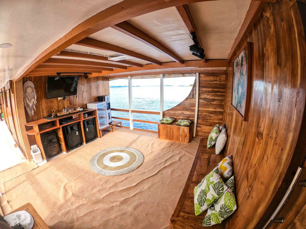 Dinara Liveaboard features a total of 7 cabins with a capacity of up to 20 guests. The boat offers 5 private cabins and 2 shared cabins, providing comfort and flexibility for different types of travelers. The dining room is equipped with a TV and speakers for karaoke, while the sundeck on the upper level is furnished with comfortable lounge chairs, perfect for relaxing and enjoying the ocean view.