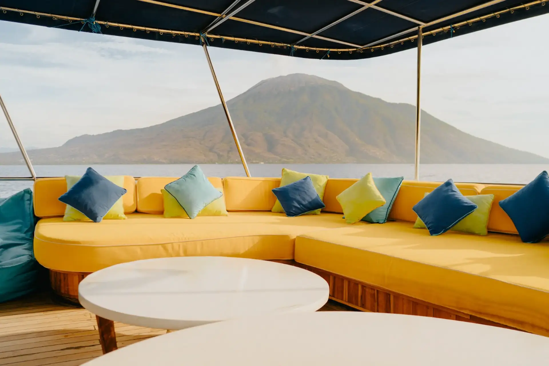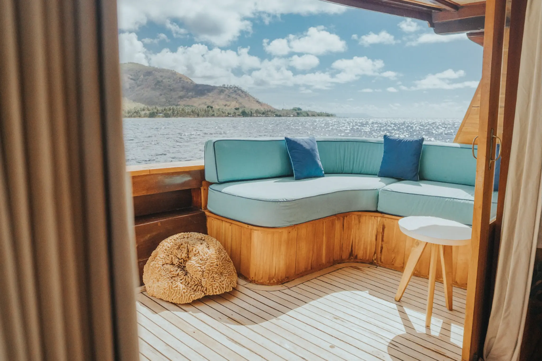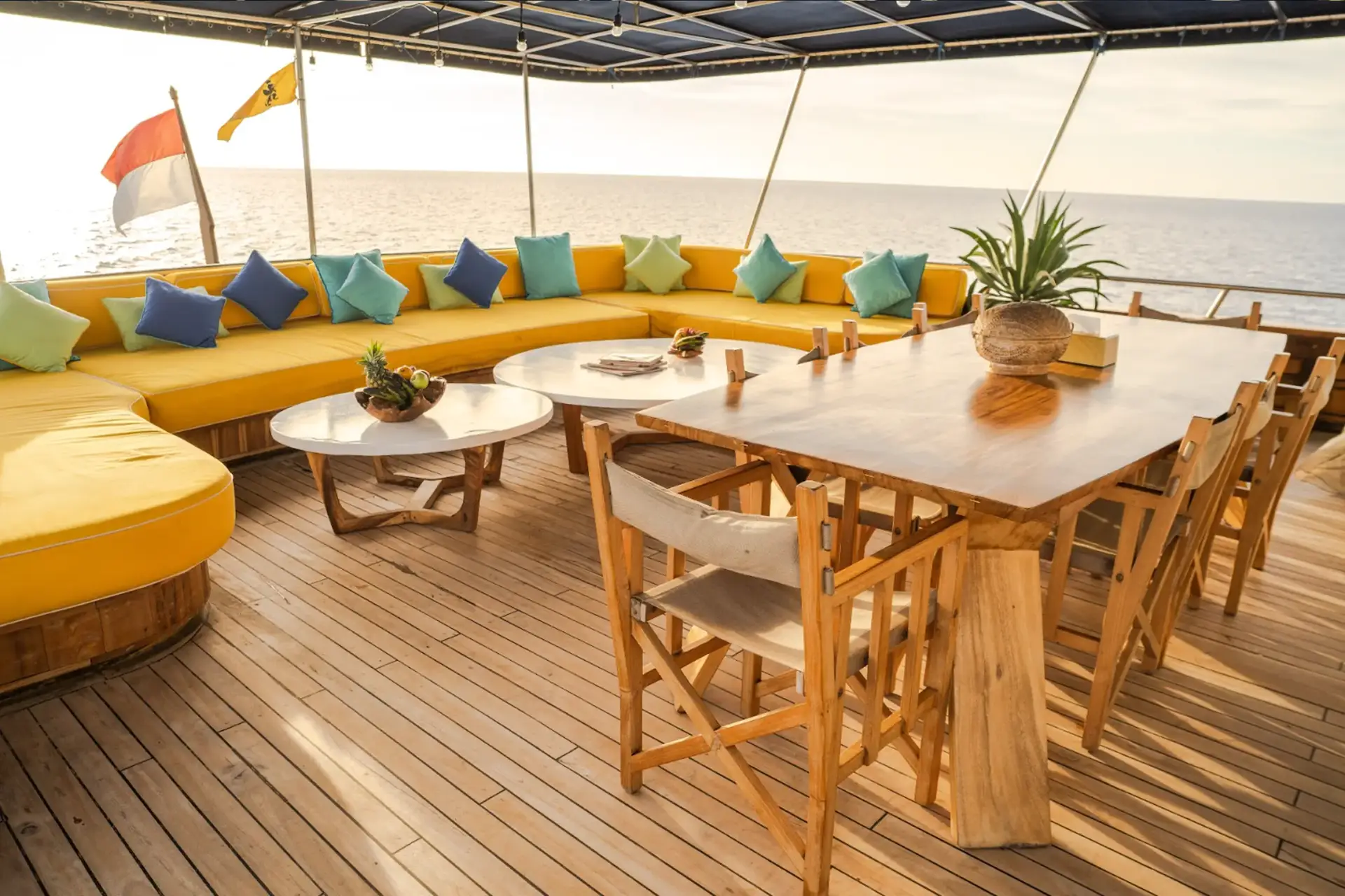 The large upper deck is equipped with a well stocked bar and is the perfect area to enjoy juices, cocktails or champagne as you drink in the alluring view where sky and sea meet. There is also a large sultan like day-bed that can host all guests at the same time; one of the reasons why the boat is among the best liveaboard in Komodo for a perfect blend of social.