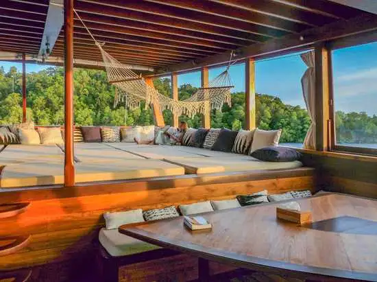 Indulge in the pleasures of outdoor dining against stunning backdrops, while the open upper deck space invites you to embrace the serenity of the sea. Equipped with air conditioning and Wi-Fi, this vessel ensures comfort and connectivity throughout your voyage.