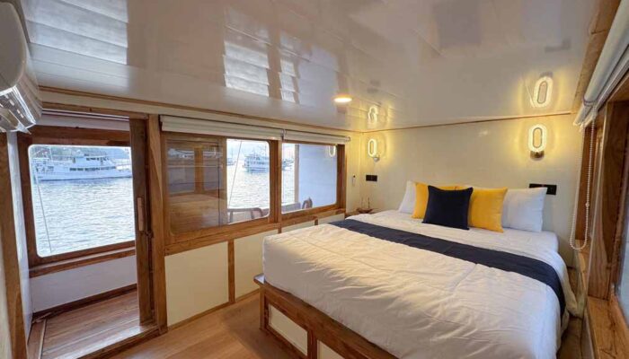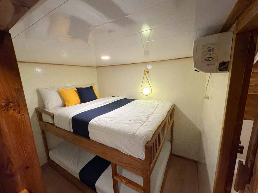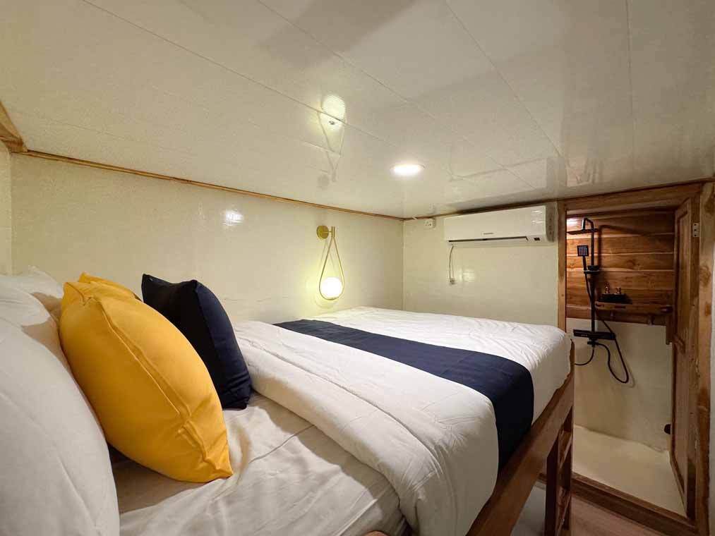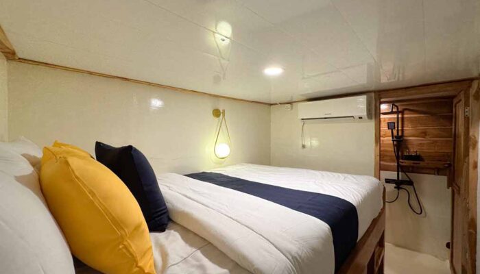 The boat offers additional extra beds and features a relaxing area with a private balcony, perfect for enjoying the ocean view. Cabins are equipped with air conditioning and an ensuite bathroom with a shower and toilet, along with fresh towels, soap, and shampoo for your convenience. Located on the upper deck, these amenities provide comfort and a pleasant stay for all guests.