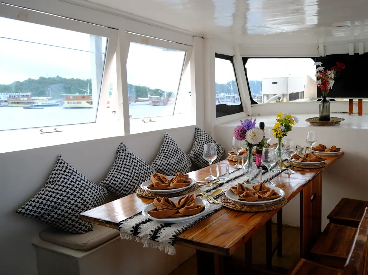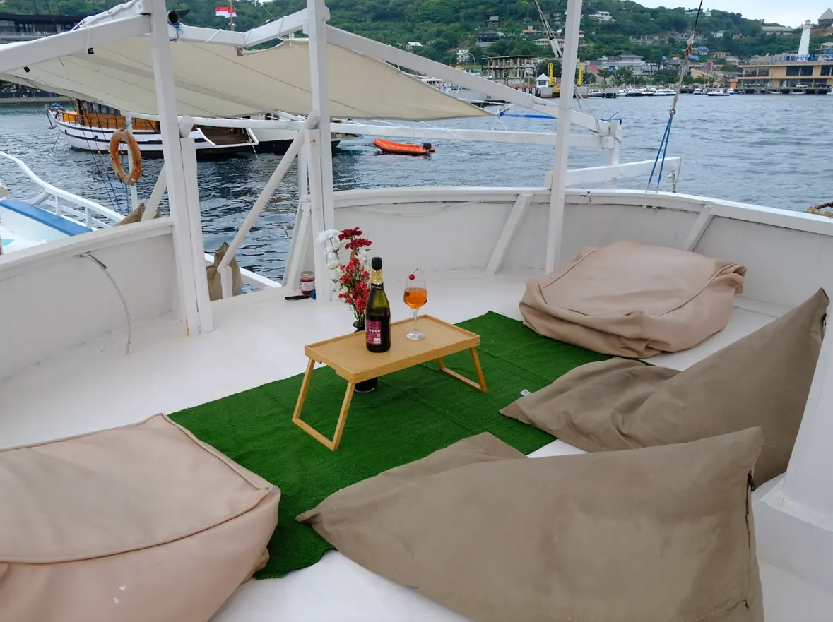 Experience Komodo National Park with Giona Cruise Liveaboard. With 4 cozy cabins featuring air conditioning, private bathroom, an intimate living room, a cozy dining room, and a sun-drenched sundeck. Giona Cruise Liveaboard offers a delightful journey through the wonders of Komodo National Park.